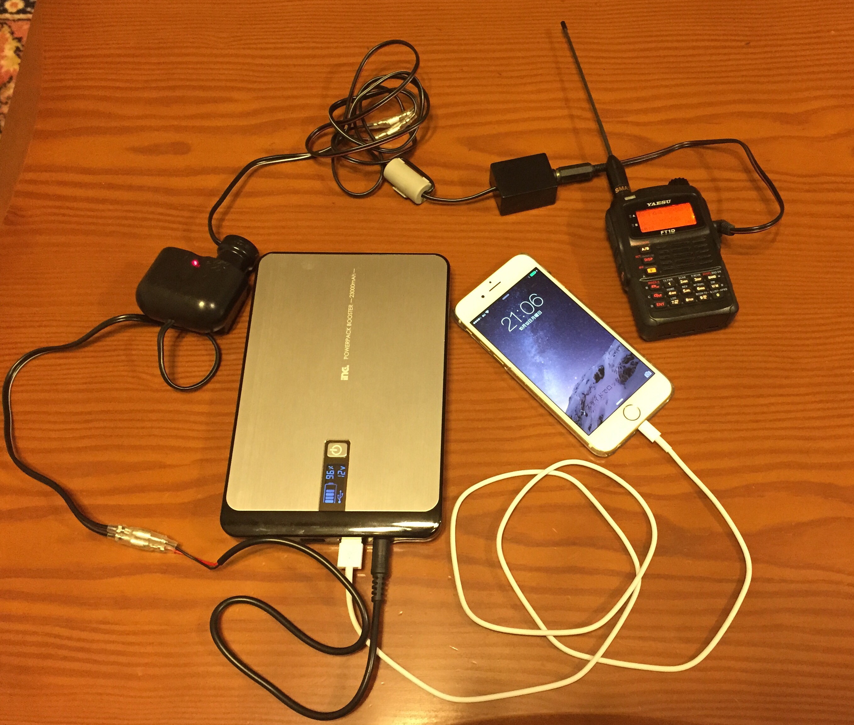 この容量で、今のところ1日使っても十分に電池が持つので非常に役立っています。今年も、旅行や移動運用に活躍しています。特に電車での移動にはなくてはならないものとなっています。下の写真を参考にしてください。この電池はすでに生産が終了していますので同等品を探すことをお勧めします。