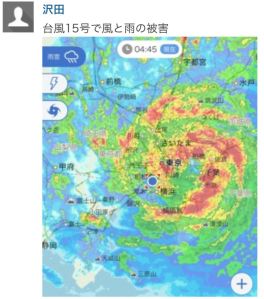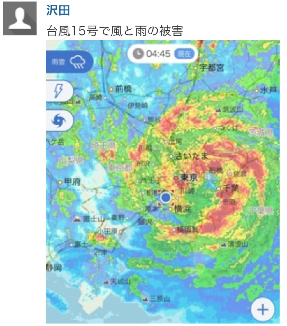 被災状況を選択すると、LINEのような画面が開き、スマホの内部カメラで写真をアップし、さらにコメントを入力することができます。以下に2019年の台風15号が横浜に来たときの書き込みの例を紹介します。