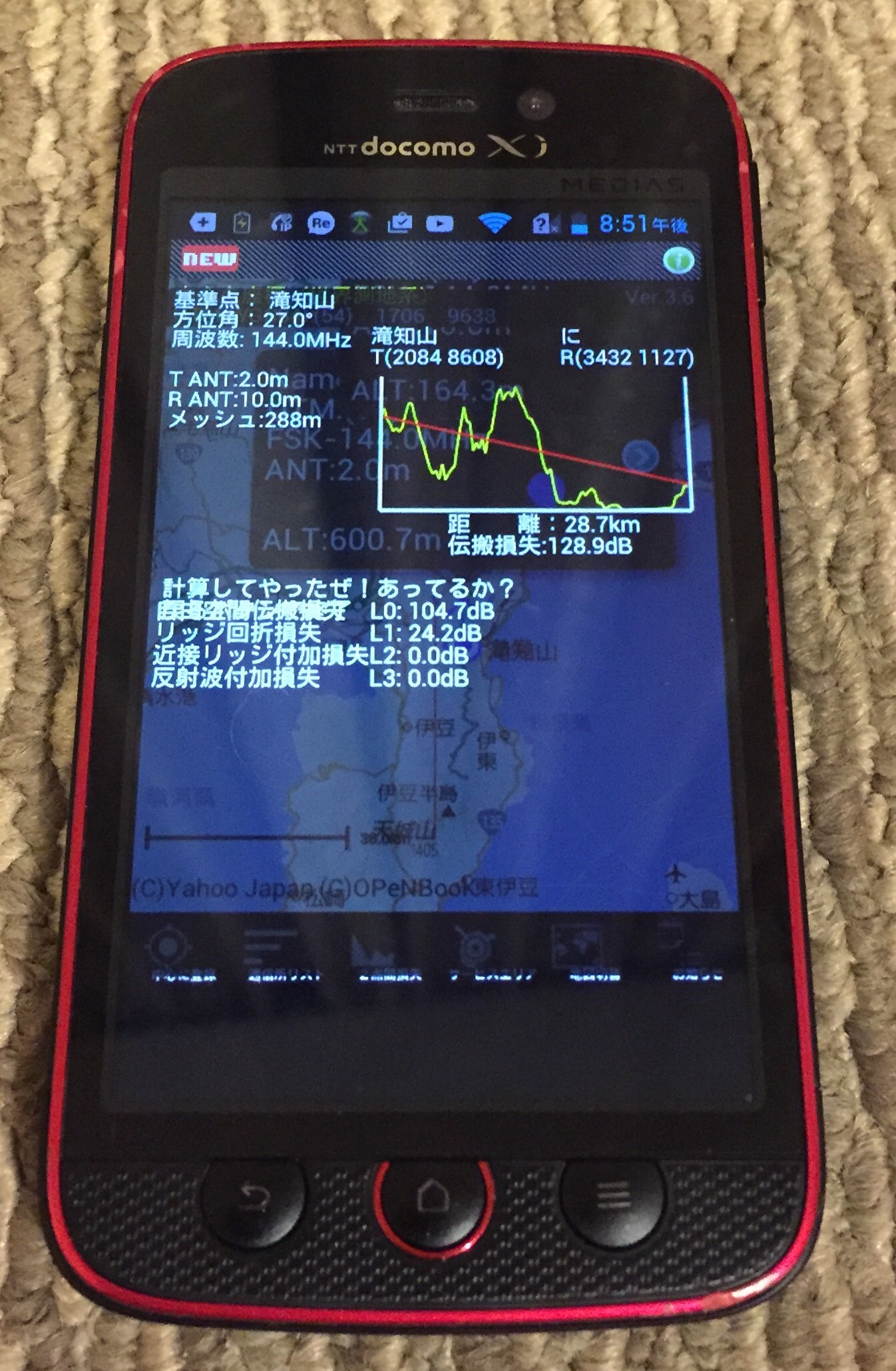 伝搬損失計算をした結果、受信点までの距離は126.8km、 受信点の信号強度は-120.7dBm となり、-100dBmまでの受信が可能であるとすると、20.7dB足りないという結論になります。間にある牧之原台地の影響が大きいと思われます。