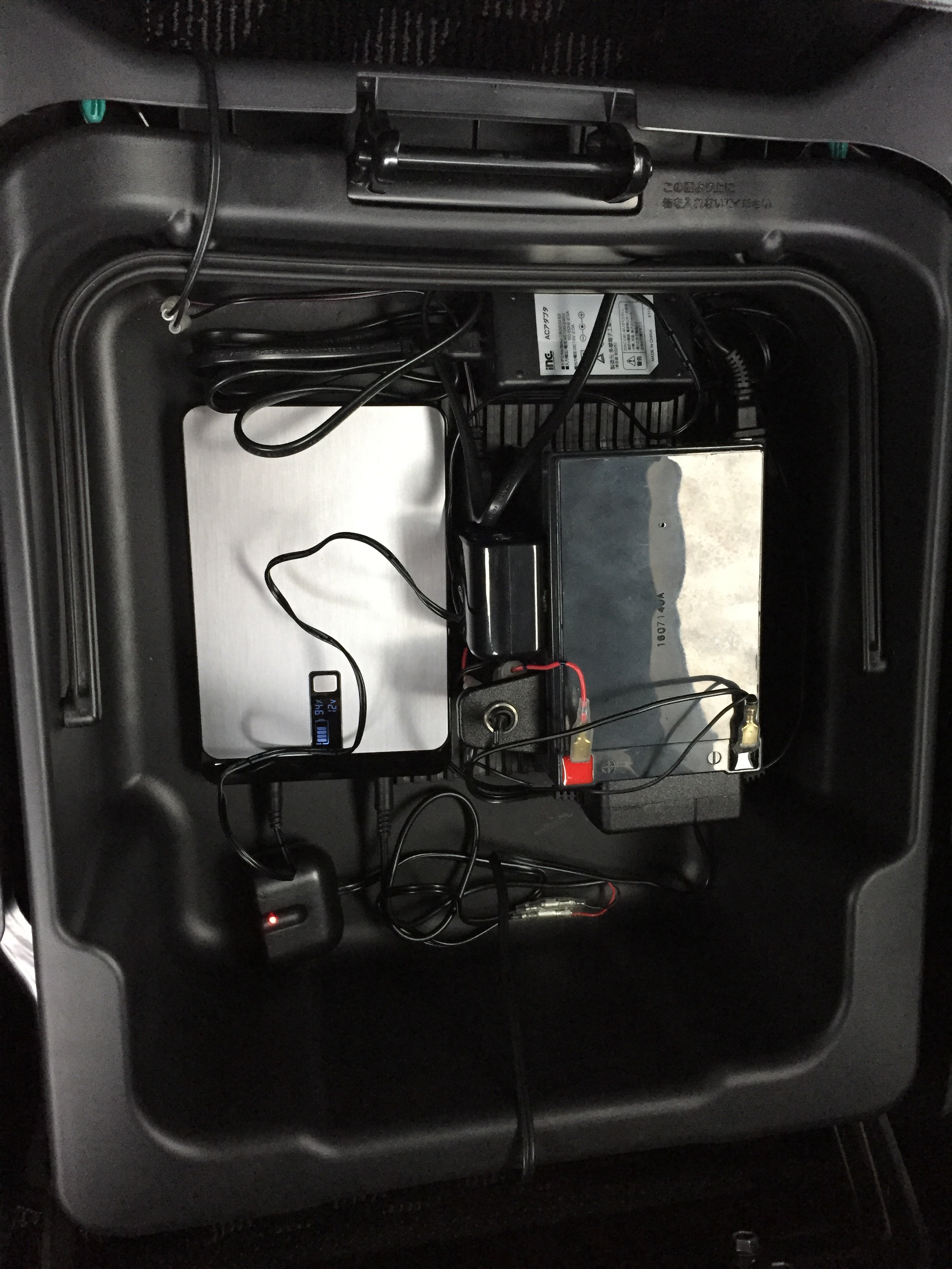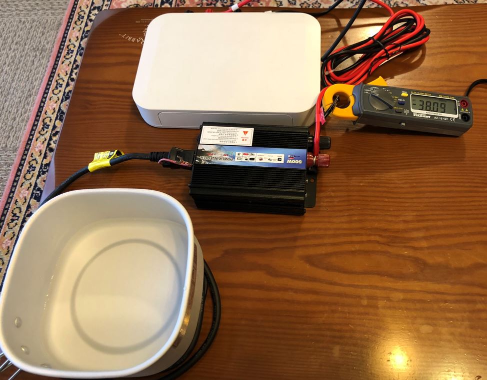 少しアマチュア的な実験になっていますが、上の写真のような構成でAC100Vに昇圧した後に、電熱器でお湯を沸かすという構成にしました。
